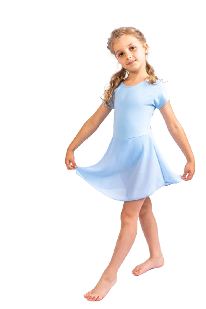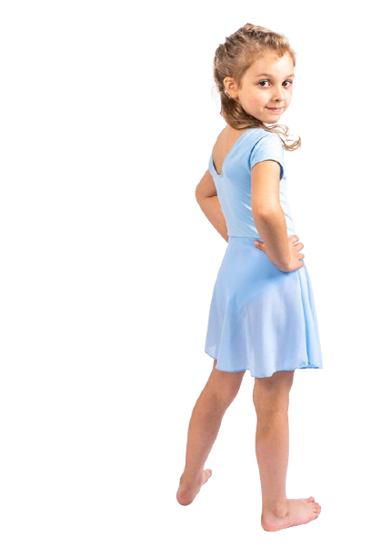 Strój baletowy NIEBIESKI to body gimnastyczne z krótkim rękawem z wszytą w pasie asymetryczną szyfonową lekką spódniczką.
